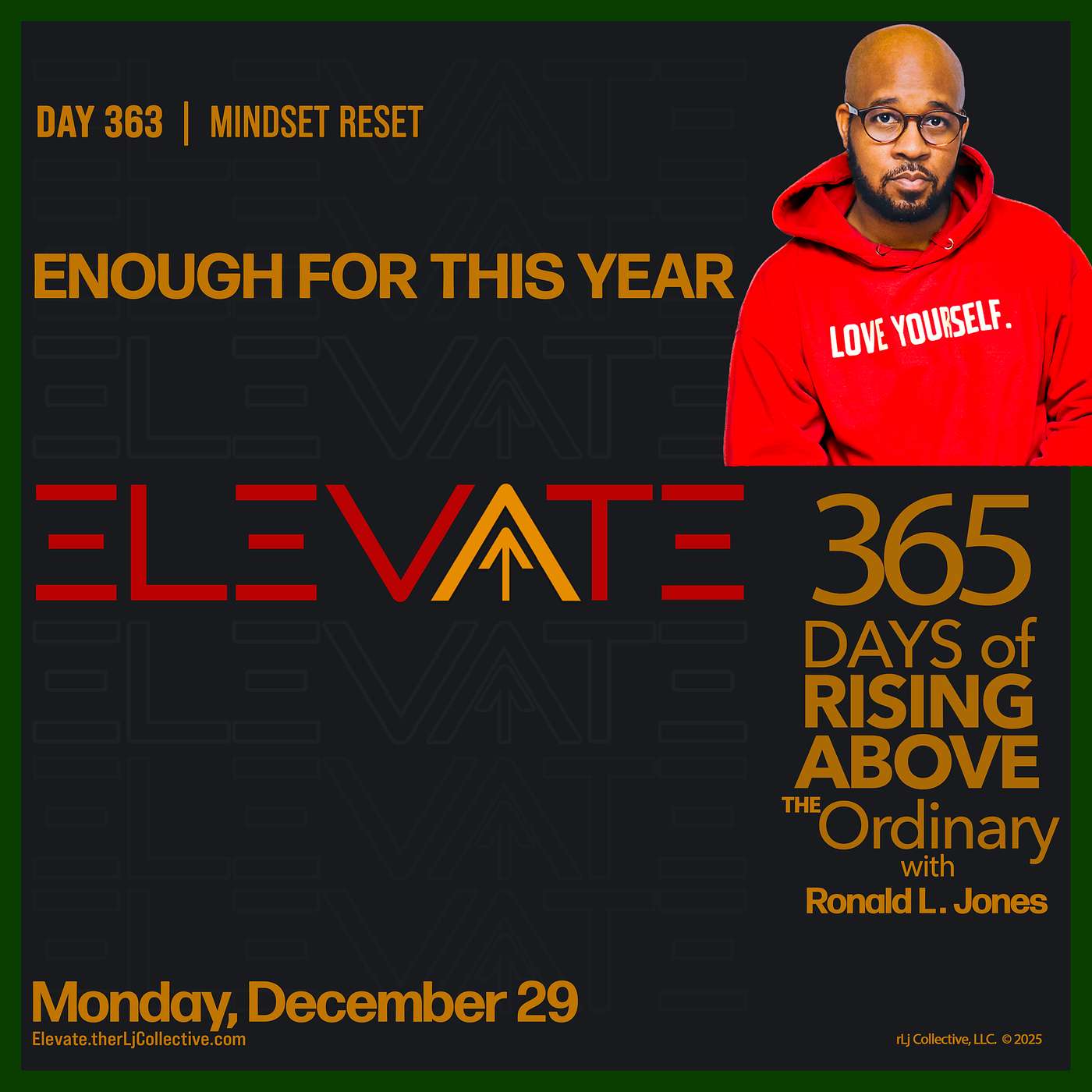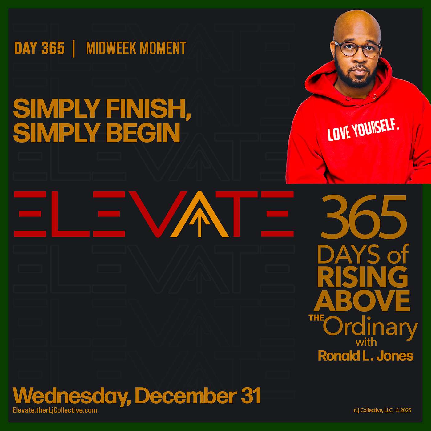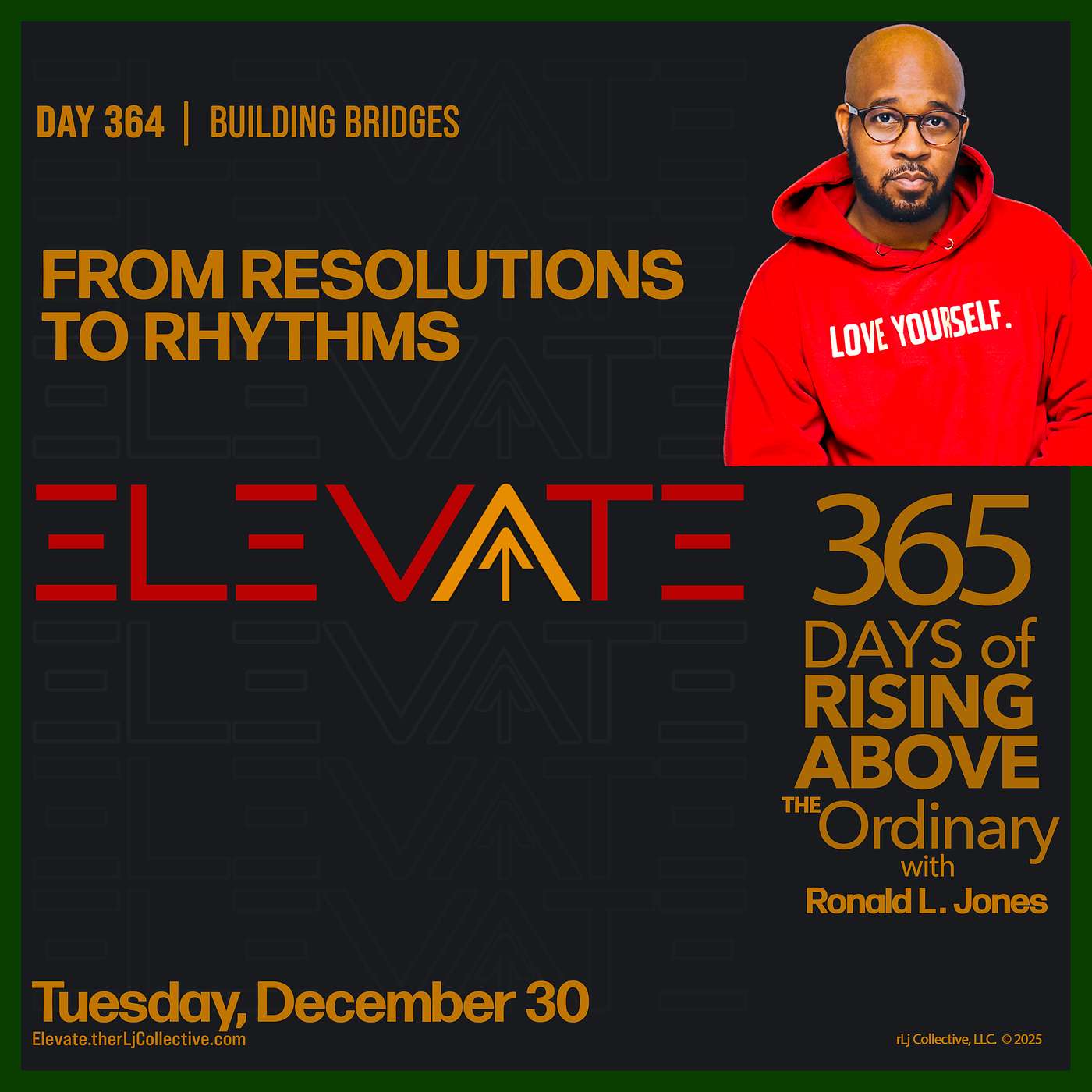 Welcome to ELEVATE 365, your daily dose of inspiration, empowerment, and actionable insights to help you rise above the ordinary. Hosted by Ronald L. Jones, a leadership and relationship coach and consultant, this podcast is your 3-minute reset to start the day with intention and purpose.Whether you're navigating personal growth, building stronger relationships, or leading with impact, each episode offers a moment to pause, reflect, and elevate your mindset. Join us every day for 365 days of clarity, focus, and small steps that lead to big transformations.Because every day is an opportunity to rise higher—let’s elevate together.