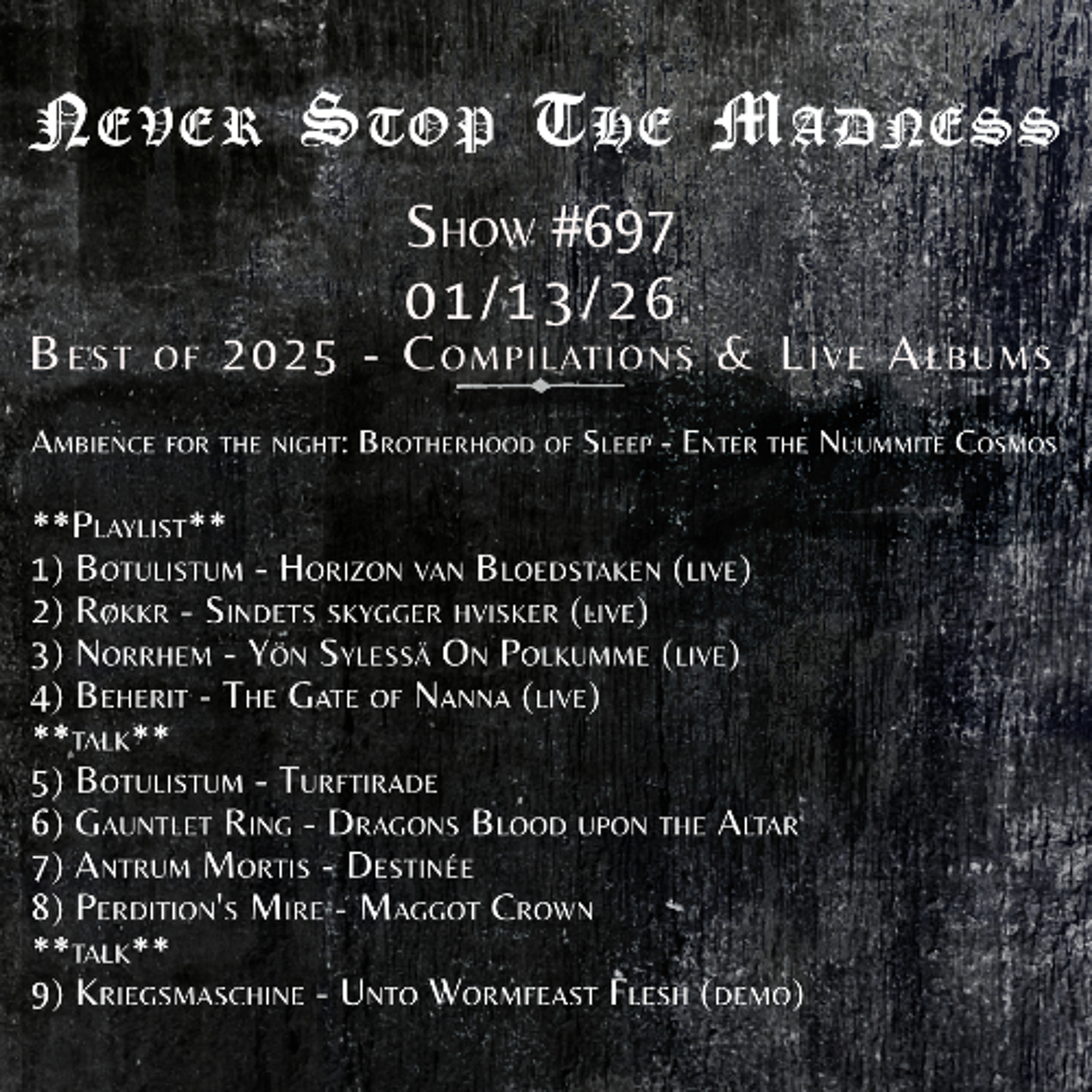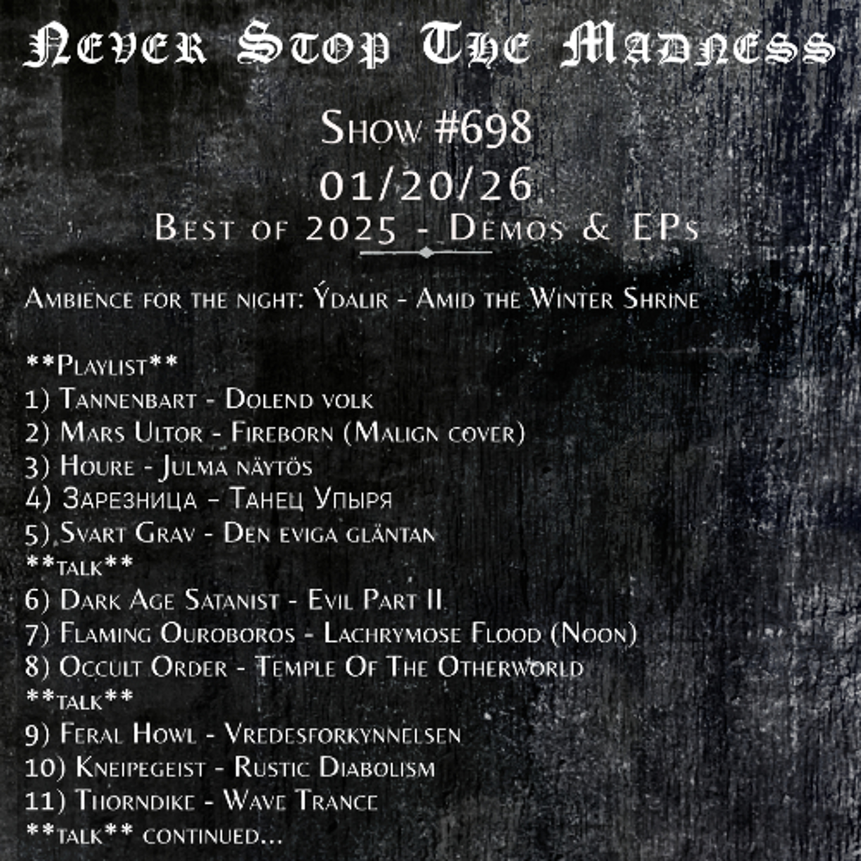 BLACK METAL - Live broadcast, every Tuesday at 9pm ET on NSTMRadio.com. Past Shows, News, and more @ NSTMRadio.com Contact NeverStopTheMadnessRadio@gmail.com for info about music submissions.